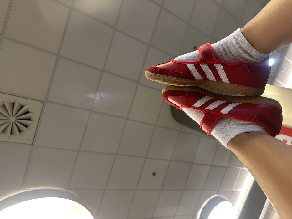 A pair of human legs, exhibiting a light to medium brown skin tone, are elevated against a white suspended ceiling. The feet are clad in red Adidas Samba Mary Jane-style sneakers, featuring white parallel stripes on the sides and a red T-bar strap across the instep. White ankle socks are visible beneath the shoes, and the gum rubber outsoles are prominent. The background ceiling is composed of white square acoustic panels, with a circular white light fixture positioned on the left and a white circular air diffuser visible in the upper left quadrant. No specific identifying architectural or contextual features are present to pinpoint the exact location within the Spata-Loutsa Municipal Unit, Greece; the environment is consistent with a generic indoor commercial or public building.