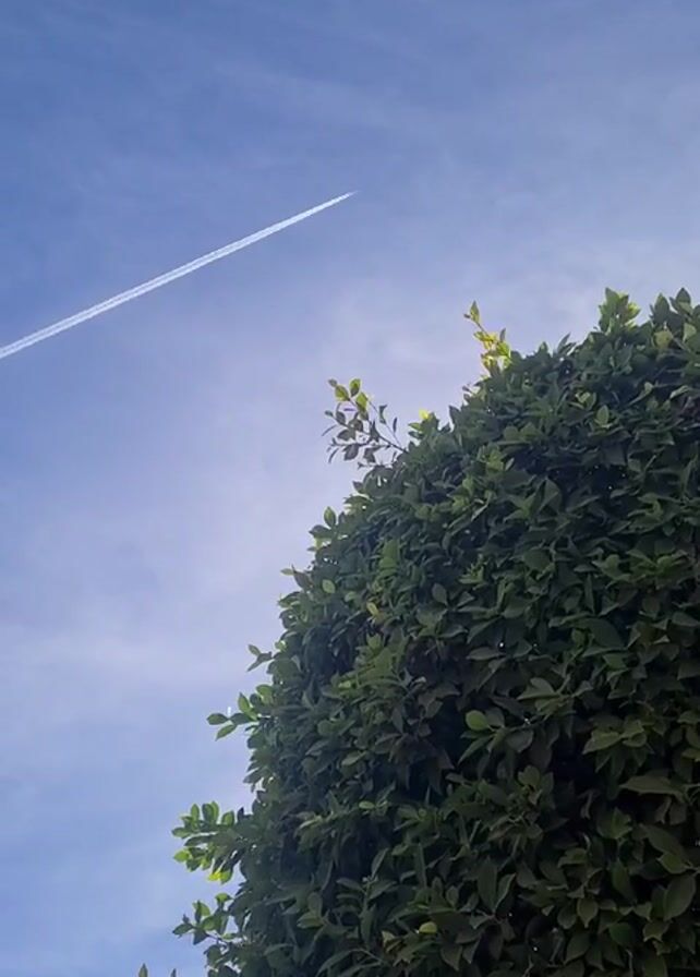 bright, blue sky with a wispy white contrail left by a passing airplane. The lower right of the frame is occupied by a large, leafy green bush or tree. The camera remains static throughout the video.