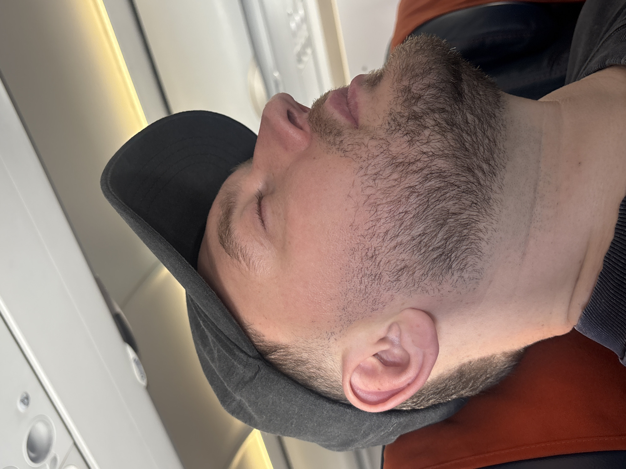 A man with a short beard, wearing a black baseball cap and an orange shirt, is sleeping on a plane