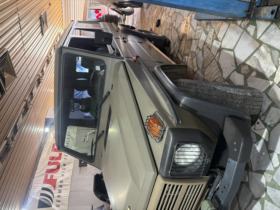The image displays the interior of an auto repair shop or garage in Varna, Bulgaria. A multi-door Mercedes-Benz G-Wagen, finished in a matte desert tan or light khaki color, is centrally positioned, angled slightly towards the left. The vehicle's front features a rectangular headlight covered by a black protective grid and an orange-amber turn signal on the fender, also protected by a black grid. A dark, robust front bumper is present. The windshield has two black wipers, and the side windows are dark-tinted. Aggressive-tread tires are visible on the front and rear wheels. On the upper left wall, a white banner is displayed with the text "FULDA GERMAN HIGH TECHNOLOGY" in red and black. The floor is covered with irregularly shaped, light-colored mosaic tiles. The ceiling consists of corrugated metal, featuring recessed lighting and ventilation grilles. In the right background, a second, lighter-colored Mercedes-Benz G-Wagen is partially visible. A blue vertical metal post, indicative of a vehicle lift, stands on the far right. No people are present in the scene.