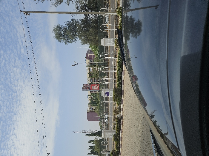 The image displays an urban street scene in Unguwar Shanu, Nigeria, viewed from inside a vehicle. The foreground shows a dark dashboard and the reflective surface of the vehicle's hood, reflecting portions of the sky and distant elements. To the left, a paved area with interlocking bricks or cobblestones is visible, bordered by a low, manicured hedge. This hedge separates the paved area from a central road median. The median is adorned with white decorative pillars and curvilinear barriers. Beyond the median lies a multi-lane asphalt road, with a faint white vehicle visible in the distant right lane. Overhead utility lines span the upper frame, supported by a wooden pole on the right and a modern street light pole to the left. The sky is light blue with scattered cirrocumulus clouds. In the background, several multi-story buildings with reddish-purple and lighter facades are partially obscured by dense green foliage. A prominent large red billboard or sign structure is situated in the central background, and a tall, slender white communication tower stands on the far left. No individuals are discernible within the frame.