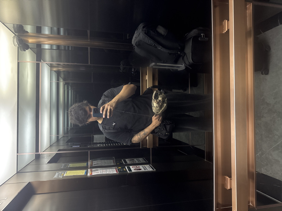 An elevator in Bangkok, Thailand, serves as the setting for a mirror selfie taken by a male individual