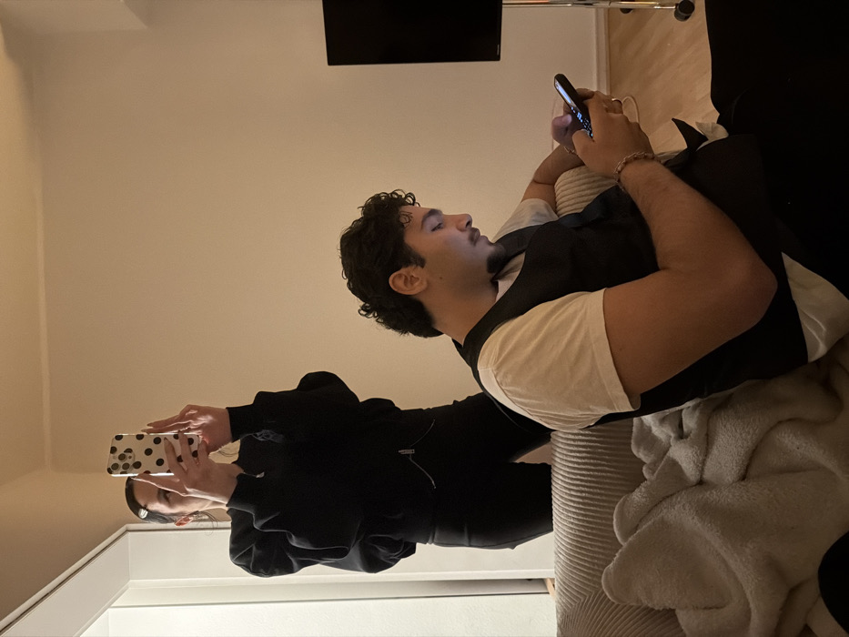 The scene depicts an indoor setting, likely a residential living space, with no discernible features specific to Dusseldorf, Germany. The exact location within the city cannot be determined from the image. Two individuals are present. A female, positioned on the left side, stands partially obscured behind a light-colored ribbed sofa. She has dark hair pulled back with white clips and is wearing a black bomber jacket with a silver zipper and dark pants. Her face is mostly hidden by a white smartphone with black polka dots, which she holds horizontally with both hands, appearing to photograph or record. To her right, a male individual is seated on the same light-colored ribbed sofa, leaning slightly forward. He has dark, curly hair, a mustache, and a short beard. He wears a white t-shirt, a dark vest, and dark pants. He is focused on a black smartphone he holds with both hands, manipulating it with his thumbs. A light-colored blanket or throw is draped over the sofa next to him. In the background, to the right, a dark, rectangular television screen is visible on a silver-colored stand with wheels. The walls are a light, solid color, and the floor appears to be wood. A white door frame is visible on the far left. The lighting is artificial, illuminating the subjects and casting some soft shadows. There is no direct interaction between the two individuals.