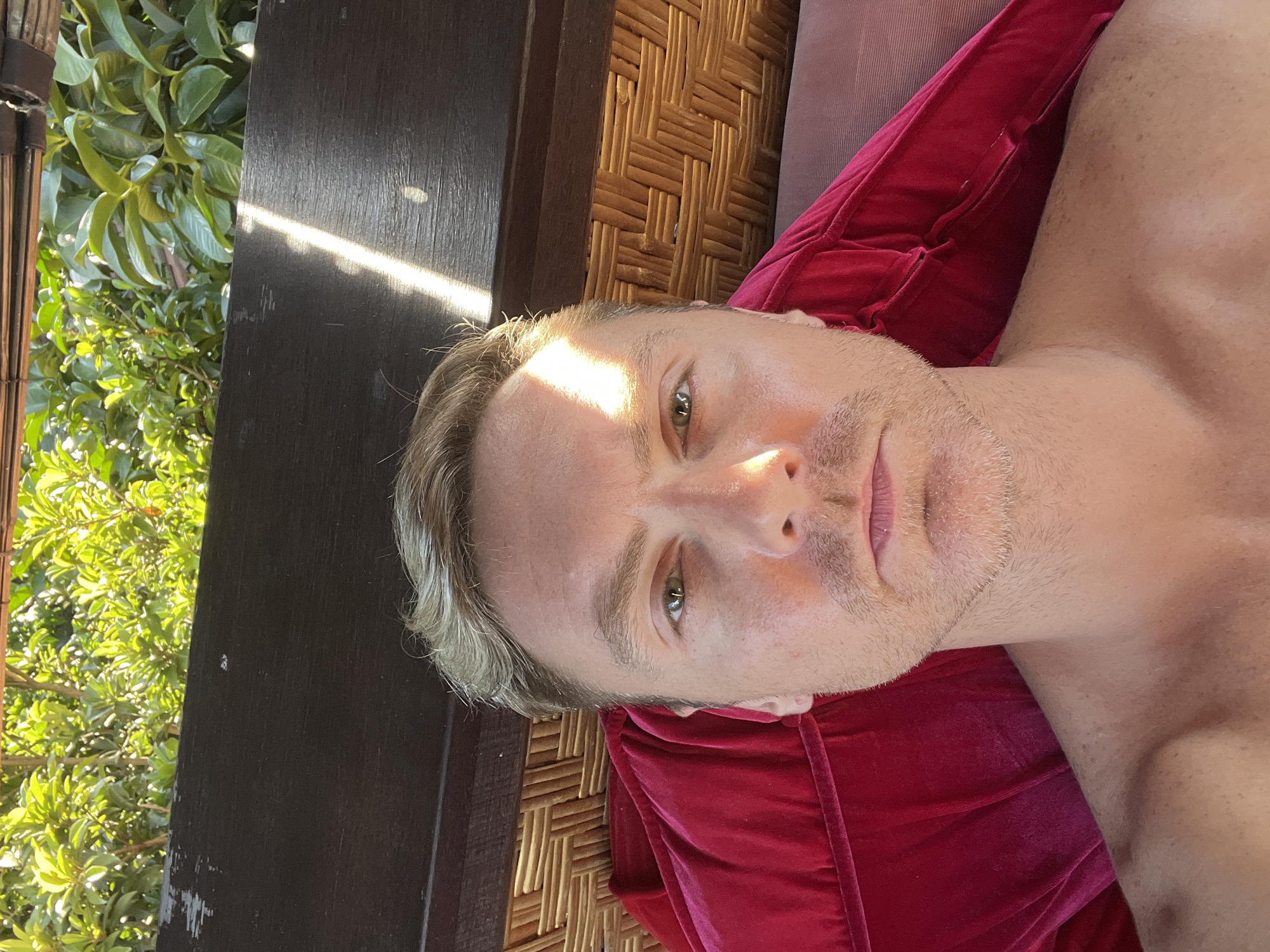 A medium shot depicts a shirtless white man lying on his back on a red pillow. He has short blond hair and stubble, and is looking directly at the camera. Sunlight is cast on his face. He is lying on a woven mat. To his left, there is a dark brown wooden panel and green foliage. The location is in Ubud, Indonesia.