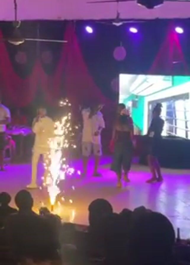stage performance. A man in a white suit holds a microphone and appears to be singing. Four other individuals are standing on stage, including two women in dresses who appear to be dancing. A spotlight on the left side of the stage casts light on a fountain of sparks, and a large screen behind the performers displays a video feed of an exterior scene. The room is dimly lit with purple lighting. The audience is visible in the foreground.