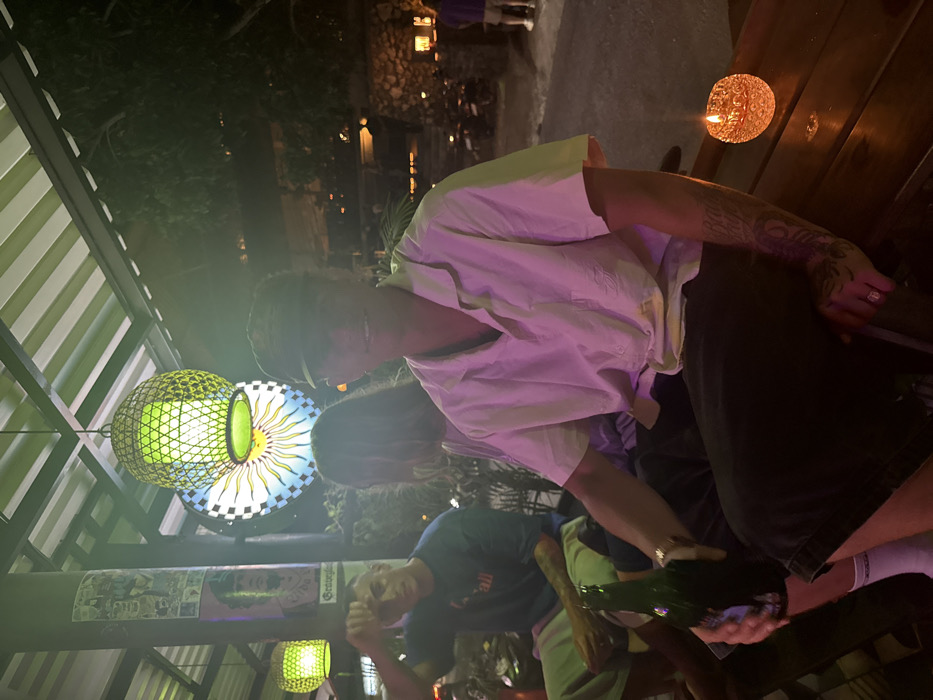 The scene depicts a nighttime gathering in an outdoor establishment in Uluwatu, Indonesia, likely a bar or restaurant