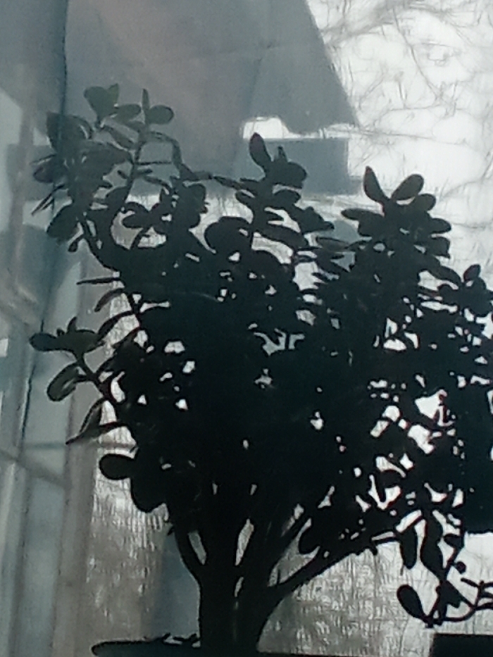 The image displays a dark silhouette of a potted plant positioned indoors against a brightly illuminated, textured background, located in Yarun, Ukraine. The plant, exhibiting numerous rounded leaves and a branching form, appears consistent with a jade plant (Crassula ovata). Strong backlighting renders the entire plant as a black shape, obscuring its inherent color and surface specifics. The background is characterized by a bright, predominantly white, crinkled or textured pattern, suggestive of a sheer curtain or heavily frosted window pane. No individuals, discernible actions, or additional specific objects are present within the frame.