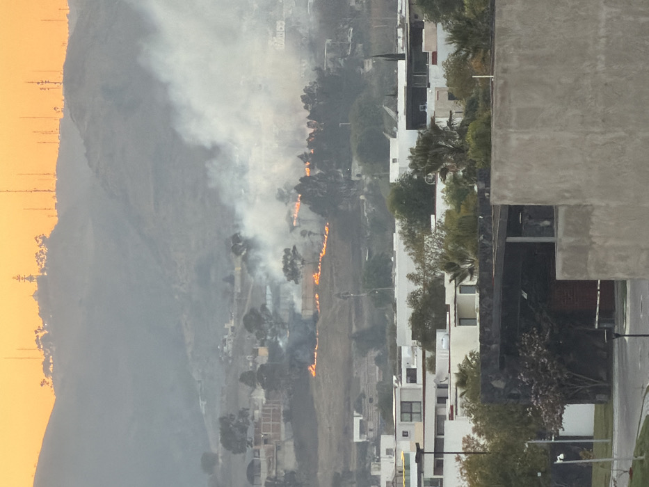 A landscape view showcases a hillside ablaze with a visible fire line and plumes of smoke. Residential buildings are situated on the right, including a modern concrete structure. The left of the scene is dominated by a large mountain and the sky with a sunset tint. The fire extends horizontally across the hillside, in proximity to the residential area.