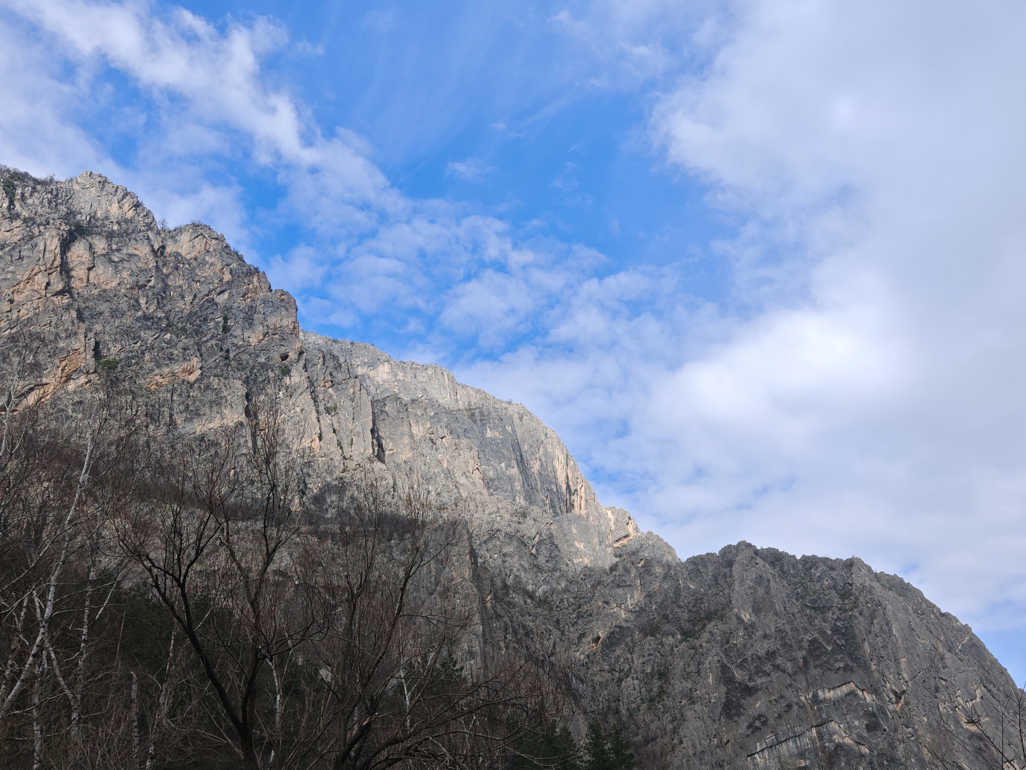 The image depicts a large, craggy mountain under a sky with scattered clouds. The mountain dominates the frame, its rock face showing signs of erosion and weathering. The lower portion of the image features bare trees in the foreground. The sky is blue, with patches of white clouds distributed throughout. The scene is likely located in the city of Vratsa, Bulgaria, given the mountain's characteristics.