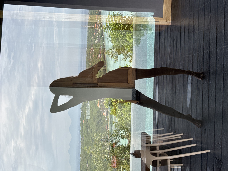 A reflective surface merges the interior and exterior. A coastal landscape, including lush greenery and ocean views, is seen through the window. Simultaneously, a person's silhouette and legs, along with modern chairs, are reflected. The reflection blends the natural scenery with domestic elements. Dark wooden flooring is visible within the room. The image is captured in landscape orientation.