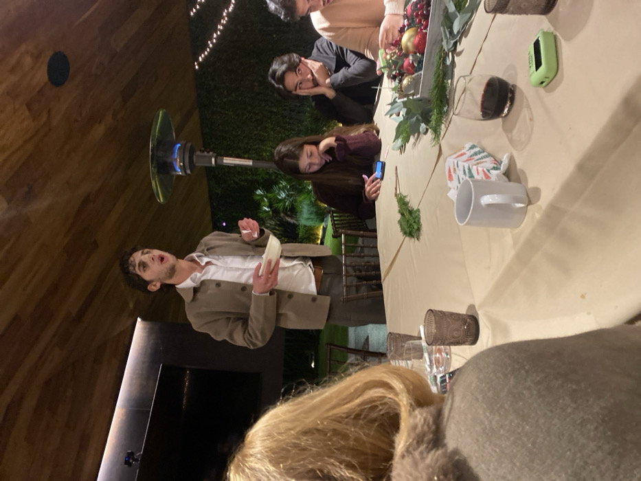 People are gathered around a table covered in a cream-colored cloth. One man, dressed in a beige jacket, reads from a paper. A woman next to him looks at her phone. Two other individuals sit across the table. On the table is a centerpiece with ornaments and greenery, a white mug, and a wine glass. In the background, there is a heater, greenery, and a wooden wall.