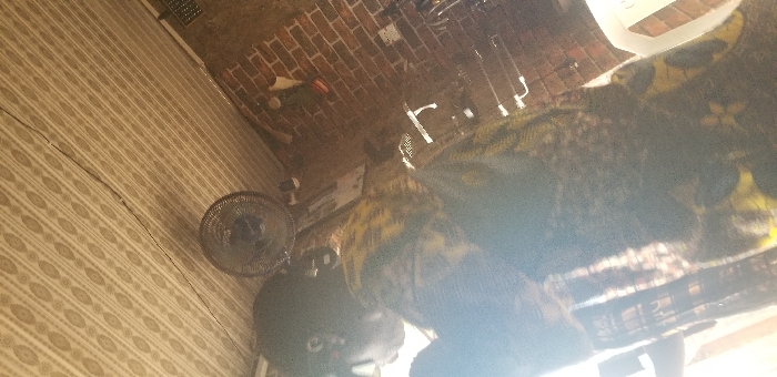 The image depicts an indoor scene in the city of Unknown, Unknown, captured at an acute angle. A single individual is visible from behind and to the left, wearing glasses and a dark, long-sleeved garment with yellow floral or abstract patterns. They are positioned in the central-left area, facing away from the viewer. The ceiling is visible in the upper portion of the frame, featuring a beige or light brown patterned surface with a distinct diagonal line. A dark-colored wall-mounted oscillating fan is positioned below the ceiling. The right wall consists of exposed red brick, on which several white fixtures, possibly hooks or shelves, are mounted. A partial view of a white object, potentially a chair, is in the lower right corner. Illumination appears strong from the left, casting a slight haze over the central figure.