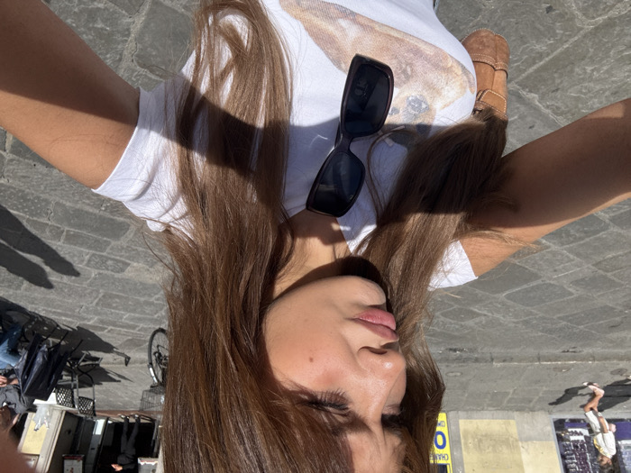 - "A female subject with long brown hair and bangs takes a selfie on a cobblestone street under direct sunlight" by FM-Jw6Zi1, licensed under CC BY 4.0