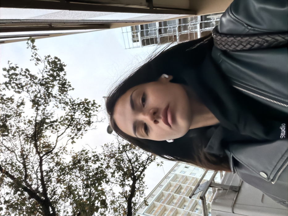 An upward-angled, eye-level shot captures a young adult female in an urban setting. The subject, positioned centrally, has long dark hair, a neutral expression, and wears white wireless earbuds. She is dressed in a dark leather jacket over a dark hooded sweatshirt featuring "Studio" branding. A dark braided strap from a bag is visible on her right shoulder. The background features an overcast sky. To the left, branches of a deciduous tree with sparse green leaves partially obscure a multi-story residential building with numerous balconies. To the right, a darker building facade is visible, and further back, a building under construction or renovation is partially covered in scaffolding. A utility box or barrier is visible in the lower left foreground. A street light fixture is present in the upper left. The scene is located in the city of Unknown, Unknown.