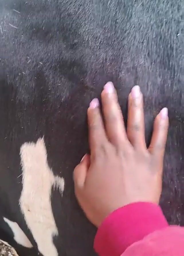 A person is petting a black and white cow. The person's hand, with light pink nail polish, is shown stroking the cow's back and head. The cow is in a pen, eating hay. The pen is made of metal bars.