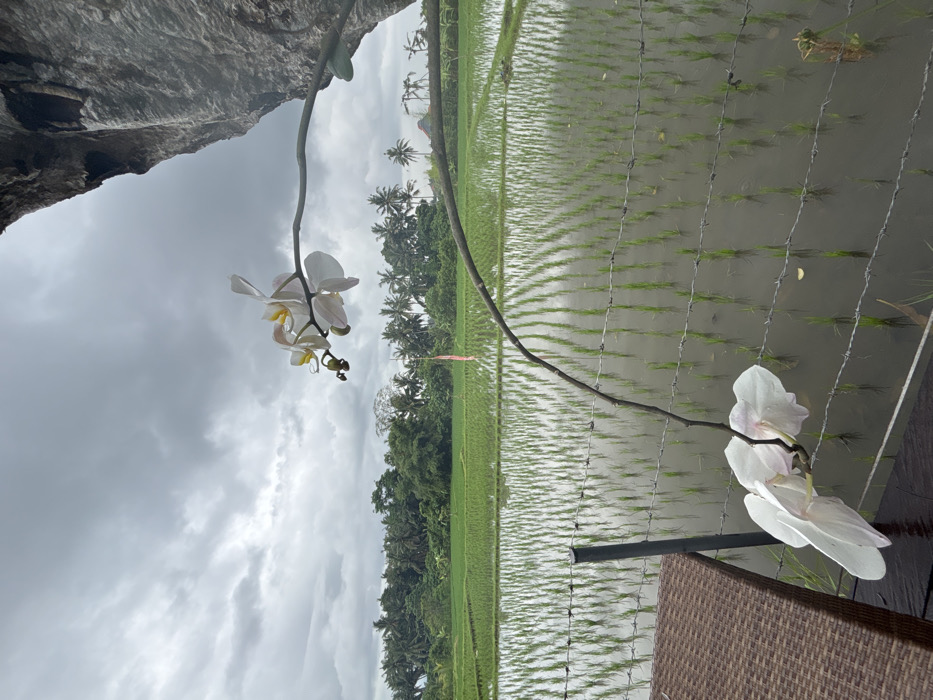 A serene landscape features a vibrant green rice paddy stretching into the distance under a cloudy sky. The flooded fields create reflective patterns. In the foreground, delicate white orchid blossoms cascade from a branch, contrasting with the rustic textures of stone and woven furniture nearby. A simple wire fence marks the edge of the paddy, and palm trees dot the distant horizon.