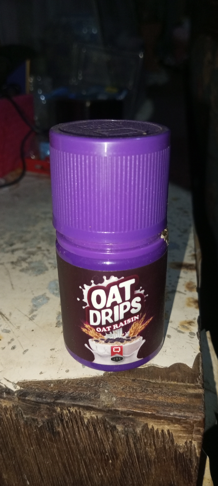 A small, cylindrical container with a purple lid stands prominently. The label, predominantly brown, features the words "OAT DRIPS" in bold, white lettering above "OAT RAISIN." Below the text is an illustration of a bowl of cereal with what appears to be oats and raisins. The container sits on a textured, somewhat worn surface with varying shades of brown. The background is dimly lit, with blurred objects adding depth to the image.