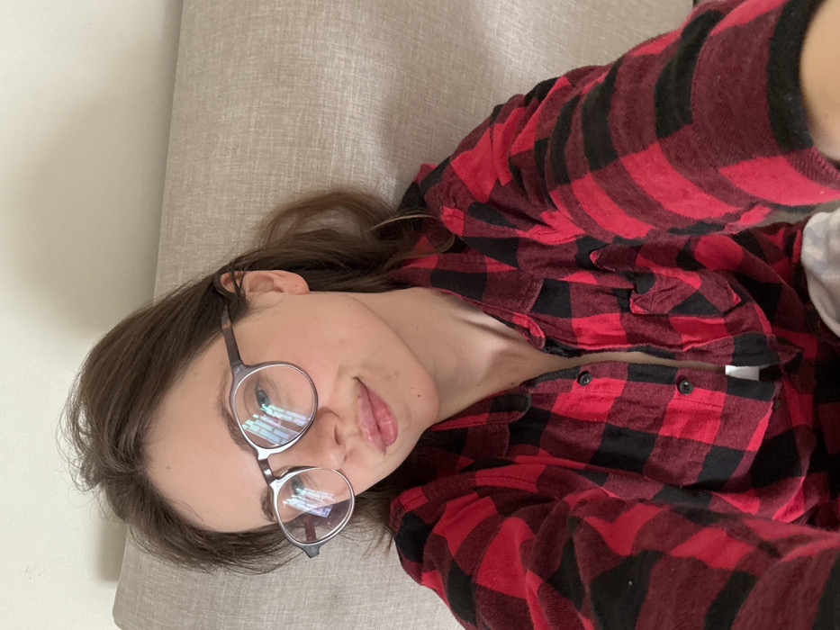 A young adult female is depicted in a close-up, high-angle selfie, identified as being in Scafati, Italy. She has fair skin, brown hair, and wears round, clear-framed eyeglasses with dark temples, which show reflections of what appears to be a window. Her lips are slightly pursed, forming a subtle smile. She is wearing a red and black buffalo plaid shirt or pajama top; the top two buttons are unfastened, revealing a small amount of white fabric underneath. The individual is positioned against a light beige or off-white fabric-covered headboard or upholstered backrest, with a plain light-colored wall visible in the upper background.