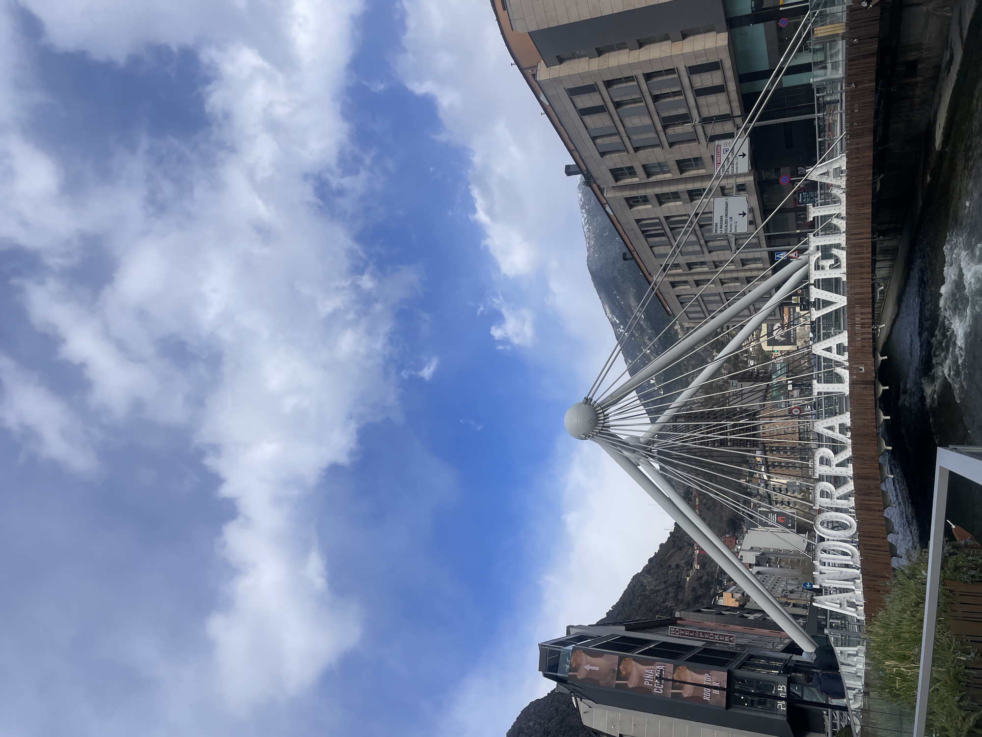 The image captures a low-angle, skewed perspective of Andorra la Vella, the capital city of Andorra. The sky is predominantly blue with scattered white clouds. An architectural element, possibly a bridge structure or a decorative piece, dominates the foreground, featuring a central white sphere supported by a network of cables. To the right of this structure, large white letters spell out "ANDORRA LA VELLA." Buildings, including some with a modern architectural style, surround the scene. Mountains can be seen in the background. Road signs and advertisements are visible on some of the buildings. The water is seen flowing below the structure. Vegetation is present to the right of the "ANDORRA LA VELLA" sign.