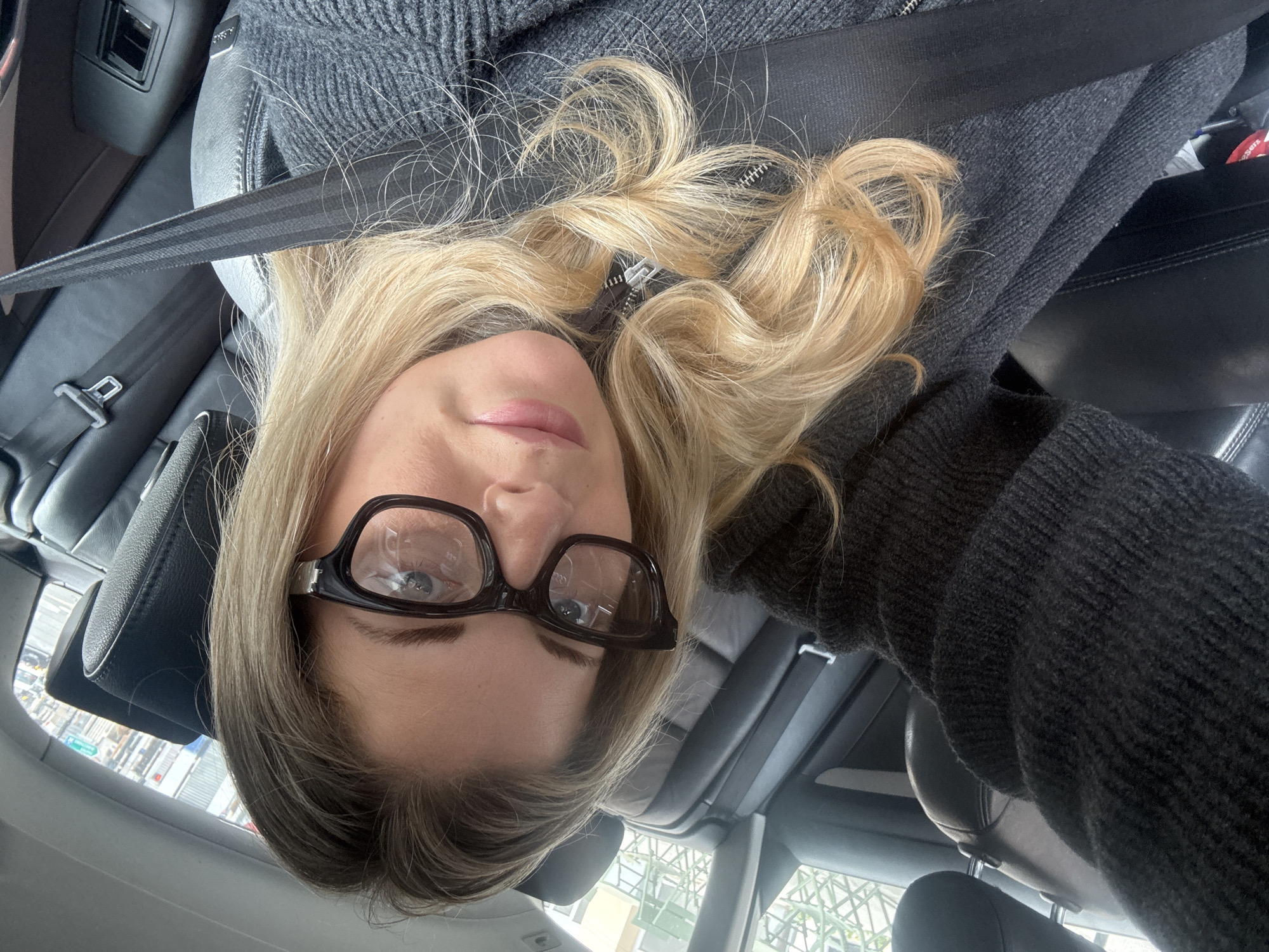 A blonde-haired female, appearing to be in her 30s-40s, is positioned in the front passenger seat of a vehicle, capturing a close-up selfie