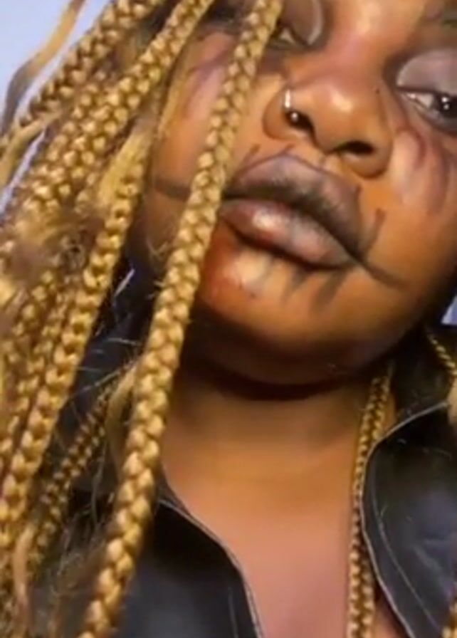 A person is shown in a close-up shot. The person has brown skin, light brown and blonde braided hair, and a nose ring. There is makeup on their face resembling the branches of a tree, with black lines extending from the forehead, eyes, and mouth. There appears to be fake blood on the lips and chin. The person is wearing a black leather jacket. The background is a light blue wall. The camera angle is slightly looking down at the person.