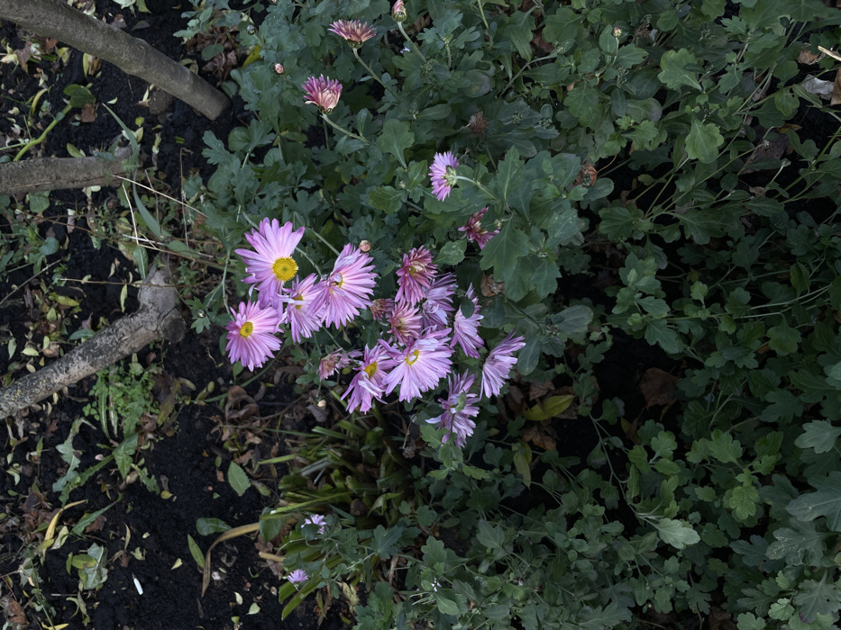 This image depicts a close-up, high-angle view of a garden bed or natural ground area. The foreground and midground are dominated by a cluster of approximately 15-20 chrysanthemum flowers, primarily in shades of light purple and pink, many featuring prominent yellow centers. Some flowers appear vibrant, while others exhibit signs of wilting or decay with browned petals. These flowers are surrounded by dense, dark green, lobed foliage. The background consists of dark, moist-looking soil sparsely covered with scattered brown and yellow dried leaves and some light green weeds. Two light-colored tree trunks or thick branches are visible in the upper right portion, extending upwards from the soil. A single white cigarette butt rests on the dark soil in the upper left quadrant. The scene suggests an outdoor, possibly autumnal, environment. The specific location within Moscow, Russia, cannot be determined from the visual information provided.