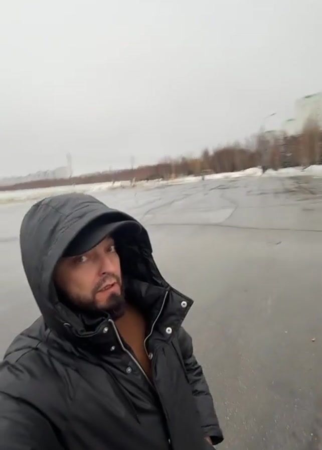 The video begins in motion, panning across an asphalt surface before focusing on a man in a black hooded jacket and baseball cap. He looks around, revealing an open area with patches of snow, buildings in the distance, and overhead lights. The scene has a grey, overcast sky and a wet asphalt surface, suggesting recent rain or snow. The man appears to be giving a view of Nizhnevartovsk, possibly commenting on the weather and environment.