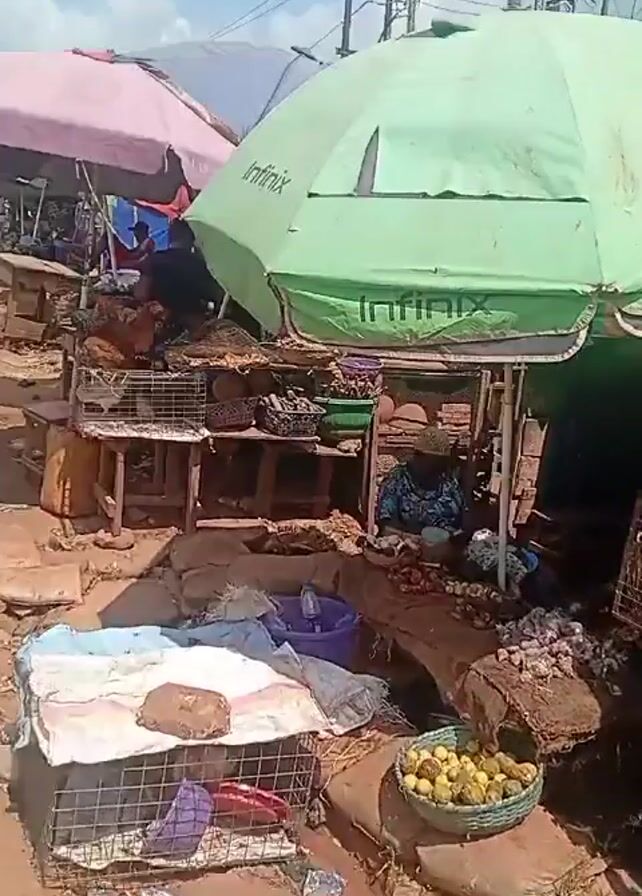n outdoor market scene. Several vendors are present, sitting behind makeshift tables displaying their wares. The ground is dirt, and there are various items for sale including chickens in cages, produce in baskets, and other goods in containers. Umbrellas provide shade for the vendors and their merchandise. Power lines are visible above the market. The sky is partly cloudy.