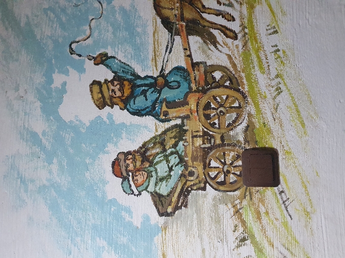 The image depicts a section of a painting, showing two men on a horse-drawn carriage. The carriage appears to have wheels and some sort of mechanism. The man on the horse is holding a whip. Below, another man is sitting on the carriage. The background is a mix of blue, white, and green, representing the sky and possible landscape. An electrical switch is overlaid upon the painting.