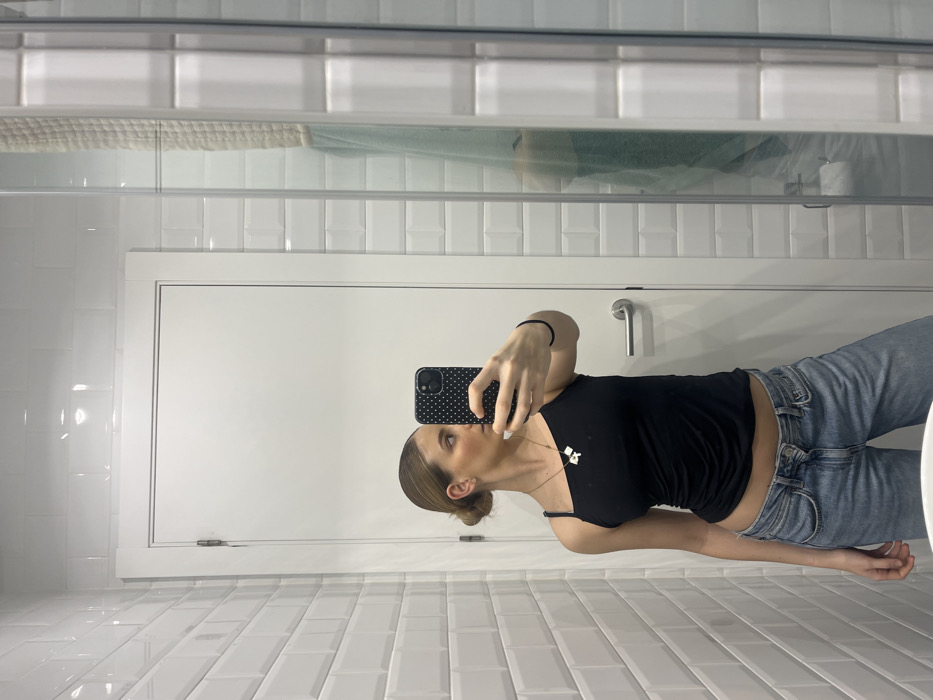A young adult female, with light brown hair pulled into a bun and wearing a black asymmetrical tank top and light blue jeans, stands positioned to the left in a reflective surface