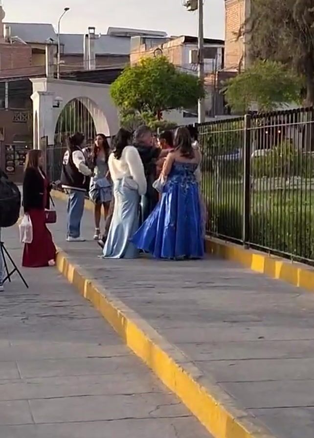 group of young women dressed in formal dresses posing for photos on a walkway with a yellow curb. Some of the women are interacting with a man, possibly a photographer or a family member. A photographer is set up with a tripod, capturing the scene. The location appears to be an outdoor public space with buildings and greenery in the background. A metal fence lines the walkway, separating it from a grassy area. A communication tower can be seen in the distance.