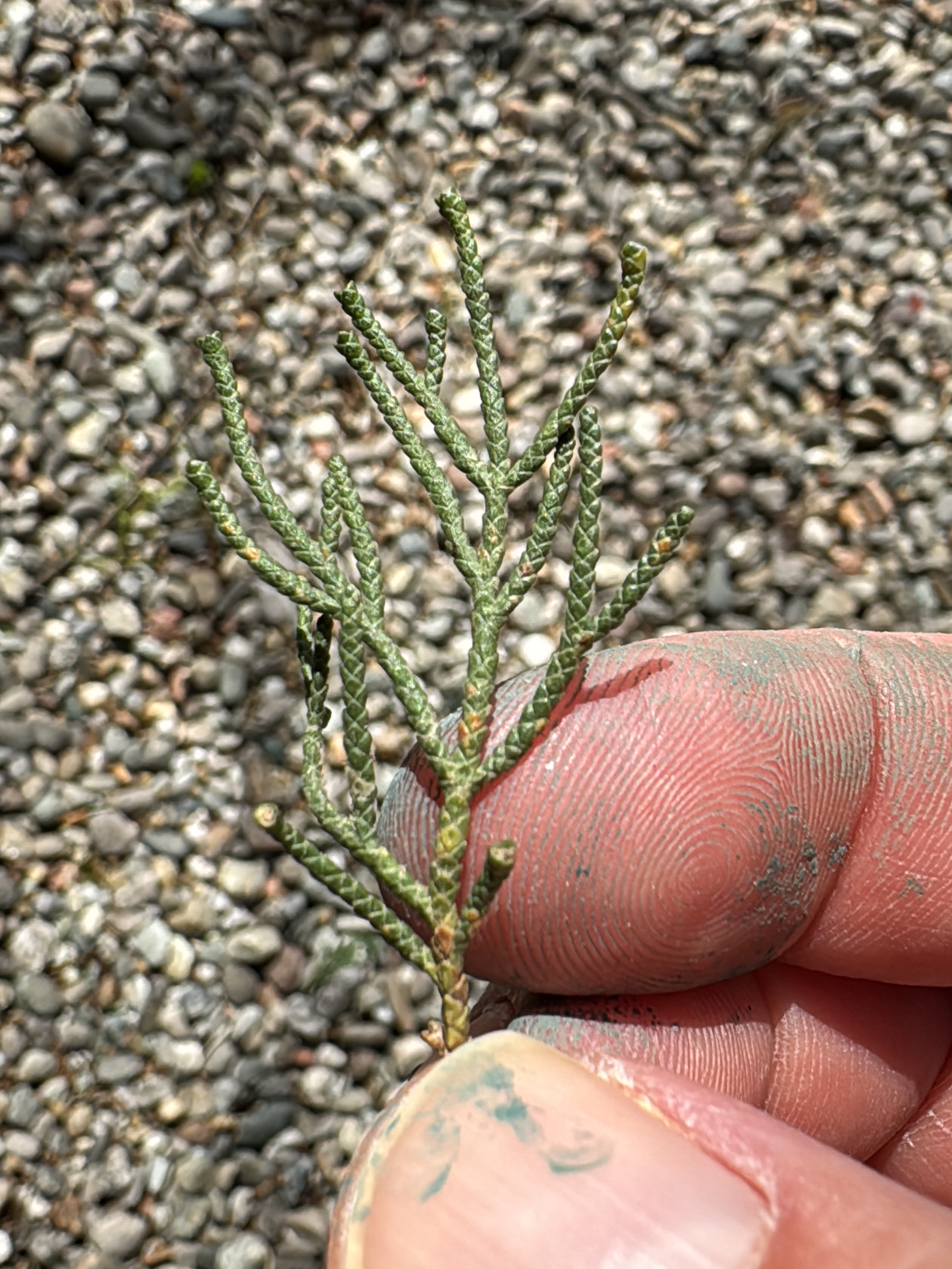 A right hand, appearing to be that of an adult, is centered, holding a small green sprig of a coniferous plant. The hand exhibits visible fingerprints and is marked with dirt and blue-green residue on the fingertips and around the nails. The plant sprig, approximately 7-8 cm in length, features numerous small, scale-like green leaves arranged along branching stems, with some areas displaying minor reddish-brown or yellowish discoloration. The background consists of a blurred, unpaved surface composed of assorted small, irregular grey and brown pebbles, consistent with gravel. The scene is illuminated by natural light. The location is Erba, Italy.