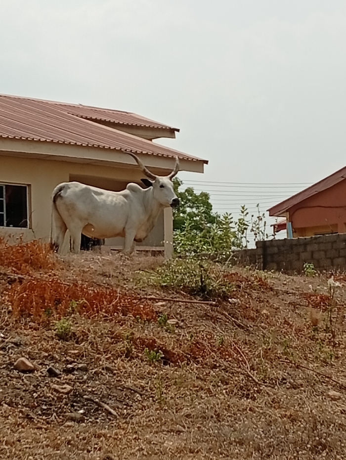 A large white cow stands near a building with a red roof. The cow has long, curving horns. The ground in front of the cow is covered in dry, brown vegetation. A second building with a red roof is partially visible behind a short brick wall. The sky is overcast. Utility poles and lines are visible in the background. The overall scene suggests a rural or semi-rural setting.