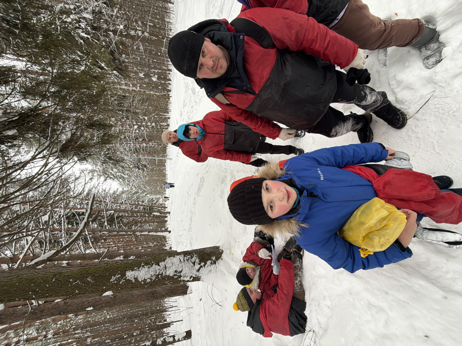 A winter scene in a snow-covered forest, identified as Люк, Russia. The image features a group of approximately eight individuals dressed in cold-weather gear. In the immediate foreground, a child, wearing a blue parka with a fur-trimmed hood and a black beanie, stands facing the camera, holding a yellow bag and a red garment. To their right, a man with a serious expression, wearing a red and black winter jacket, a black beanie, and a backpack, stands partially visible. Behind the child, on the left side of the frame, three individuals in red and black jackets are seated or partially reclined in the snow, one with a yellow and black beanie. Further down a cleared, snow-covered path that extends into the background, other individuals are visible walking or standing. All participants are clad in heavy winter clothing, primarily red and black jackets. The environment consists of dense evergreen trees heavily laden with snow, and the ground is entirely covered by a thick layer of fresh snow. The sky appears overcast.