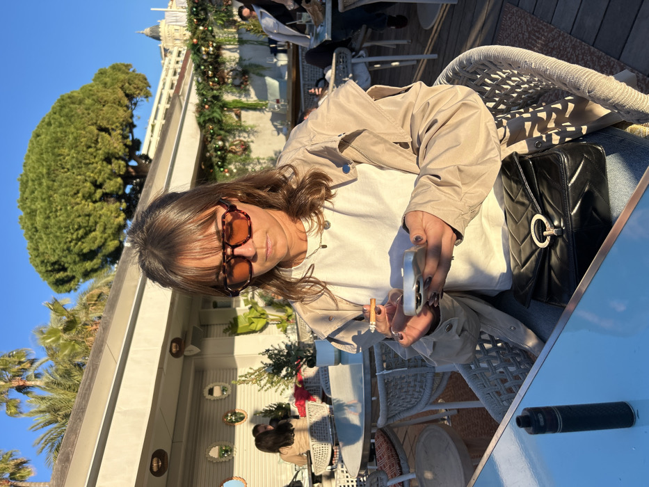 A female subject is seated at an outdoor terrace table under clear blue skies, illuminated by warm sunlight. She is positioned towards the viewer but her gaze is directed downward at a light-colored smartphone held in her left hand. A lit cigarette is held in her right hand. She wears a beige jacket over a white long-sleeved shirt and blue jeans, with tortoiseshell-patterned eyeglasses featuring amber lenses. A black quilted shoulder bag with a silver circular clasp rests on her lap. On the light blue table in the foreground, a black cylindrical vape pen with a brown top is placed to the left. The subject is seated in a light-colored wicker-style chair on a wooden deck. In the background, other patrons are visible at white circular tables with similar chairs. The terrace features small potted evergreen trees and a railing adorned with green garlands and lights. A white building wall with several oval mirrors is visible to the left. Behind the terrace, palm trees and a large, broad-canopied tree are prominent. The distinct green domed roof and spires of the Carlton Cannes hotel are visible in the far right background, identifying the location as a terrace at or near the Carlton Cannes hotel in Cannes, France.