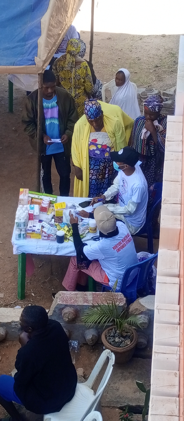 An outdoor scene depicts a temporary medical or health consultation setup under a blue and beige tarp canopy. Eight individuals are visible. In the foreground, a male in a black long-sleeved shirt and blue shorts sits on a white plastic chair, seen from the back. To his right, a person in a white t-shirt, light-colored cap, and striped pants, with "NURTURE HEALTHCARE EMPOWER FITNESS" printed on the back of their shirt, is seated on a blue plastic chair, handling items on a table. Next to them, another person, wearing a white t-shirt, black cap, and blue face mask, is seated at the same table, looking down at a tablet-like device and papers. The table, covered with a white tablecloth, is laden with numerous boxes of medications, blister packs, bottles, and medical supplies, including items labeled "HUMART" and "E-PLUS," alongside bags of cotton balls. Around the table, three individuals stand. A female in a yellow garment and patterned head covering observes the table's contents. A male in a dark jacket over a tie-dye t-shirt holds papers. Another female in a patterned dress and head covering stands nearby, looking towards the table. In the background, a female in a white head covering and white garment sits on a white plastic chair. The ground is unpaved, reddish-brown earth. A light-colored concrete or brick structure is visible on the right. Decorative carved heads and a potted plant with green foliage and rocks are present on a low wall or structure in the lower right. The overall setting suggests a community health or medical outreach event in an unspecified outdoor location in the city of Unknown, Unknown.