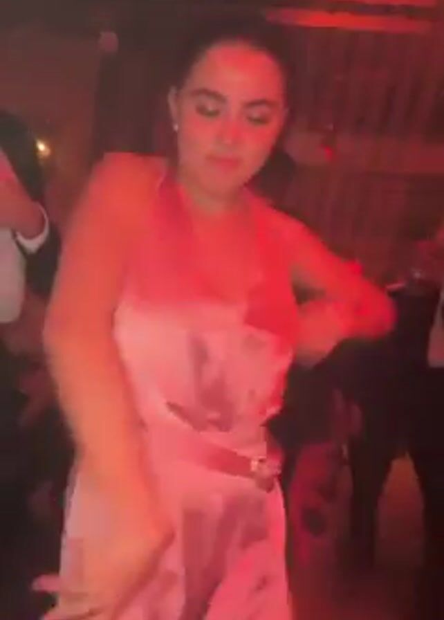 A woman in a pink satin dress dances at what appears to be a party. The environment is dimly lit with various people around. The camera's movement is erratic, swinging from side to side and up and down, making it difficult to maintain a stable view of the subject. At one point, the camera is almost completely pointed at the floor. There are glasses visible on what could be a table.