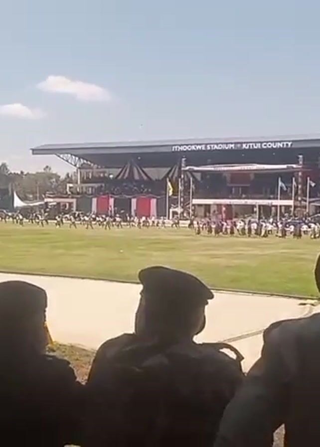 group of people performing a dance on a grassy field in front of a stadium. The stadium is labeled "Ithookwe Stadium, Kitui County". The people appear to be wearing traditional clothing. The dance is taking place during the day. In the foreground are three individuals, possibly security personnel, wearing hats and uniforms. The sky is blue with some clouds. The stadium is filled with people watching the performance. There are tents and flags near the stadium.