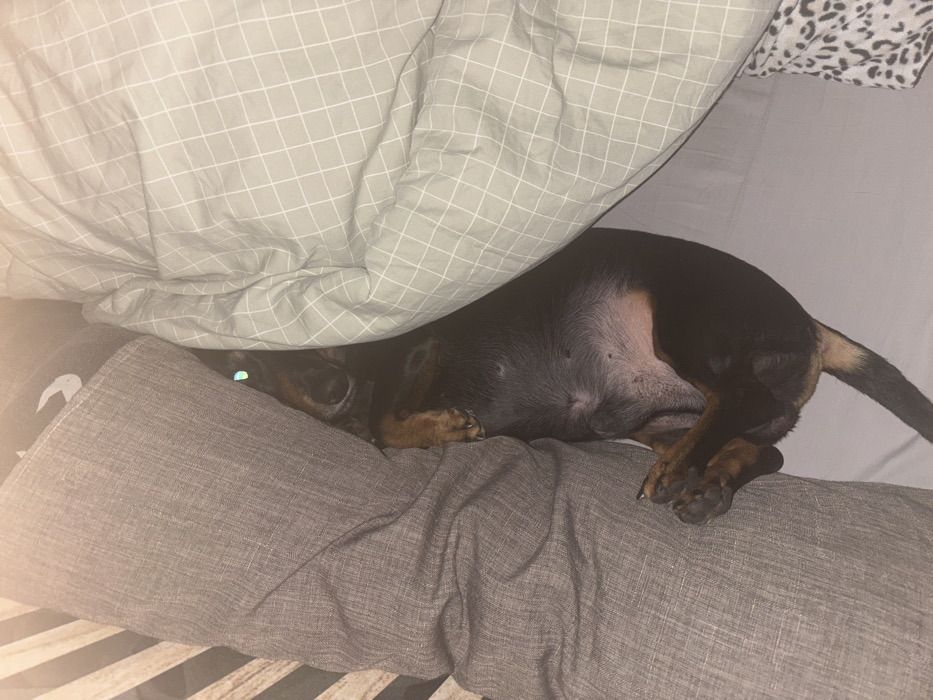 The scene is depicted indoors, within a private residence located in Rostov-on-Don, Russia. A small, dark-furred dog, appearing to be a Dachshund or similar breed, is lying on its back or side, nestled between a person's leg and a patterned duvet. The dog's light-colored belly, paws with dark claws, and a portion of its tail are clearly visible. Its head is largely obscured, but a single eye exhibiting a green-blue reflection and part of its dark snout are discernible. The dog is positioned against a leg clad in light grey fabric pants or trousers, with a dark sock or pant cuff displaying a white stylized symbol. To the dog's right, a light grey duvet with a subtle grid pattern covers part of the scene. The immediate background on the left features a striped fabric, while the lower right includes a small section of white and black leopard print material. The lighting is dim, suggesting an interior setting, possibly a bedroom, with a bright lens flare present in the upper left of the image.