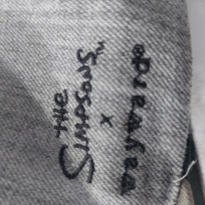 A close-up image depicts a gray, woven textile, exhibiting a distinct diagonal twill pattern consistent with denim fabric. Black embroidery is visible on the surface. The embroidered text, arranged vertically, reads "the SIMPSONS™ x wayward®". "The Simpsons™" is presented in a larger, stylized font, while "the" and "wayward®" are in smaller script. A small "x" serves as a separator between the two primary brand names. The fabric surface appears slightly worn, with minor loose fibers visible. There are no individuals, actions, or specific environmental features discernible in the frame beyond the textile and its embroidery. The precise location within Gimpo-si, South Korea, cannot be determined from this image.