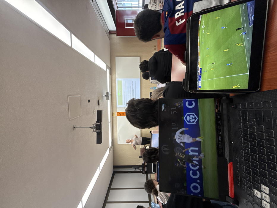 The scene is a well-lit classroom in Interlomas, Mexico, featuring white walls, a white ceiling with linear fluorescent light fixtures, and light brown desks. A female instructor with dark hair, wearing a light-colored top and dark pants, stands at the front of the room, gesturing with both hands while presenting. Behind her, a projector displays a slide titled "FUENTES" (SOURCES) with bullet points onto a white board. In the immediate foreground, a black ASUS ROG laptop rests on a desk, its screen displaying a live soccer match from "TUDN EN VIVO," showing players on a green field with a "crypto.com" advertisement banner. To the right of the laptop, a tablet in a black case also displays a separate live soccer match from "TNT SPORTS," with a score of "PAF 0 - 0 VIL." Multiple students are seated at desks, primarily visible from their backs or tops of their heads. One student in the foreground, right of center, wears a red and blue striped shirt with "FRAG" visible on the back. A white water bottle is positioned on the desk directly in front of the instructor. The room includes a dark gray paneled wall to the left and a red-framed glass door or window to the right.