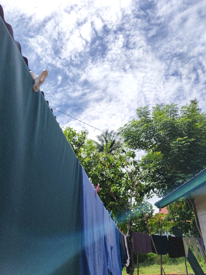 The image depicts an outdoor scene in Jurong Pante, Indonesia, under a bright, partly cloudy sky filled with scattered white cumulus and cirrus clouds. In the foreground, a dark teal or blue-green fabric, possibly a tarp or large garment, occupies the left side, secured by a light-colored clothespin to what appears to be a corrugated roofline. Adjacent to this, a blue fabric hangs from a clothesline, held by a pink clothespin. The clothesline extends horizontally across the midground, laden with various dark-colored garments drying under the sun. Lush green tree foliage, including visible palm fronds, densely populates the background. On the far right, a building section with a light blue corrugated roof overhang and a light-colored wall is visible. Further in the background, another structure with a reddish-orange tiled roof is partially obscured by trees. No individuals are present. The ground beneath the clothesline appears overgrown.