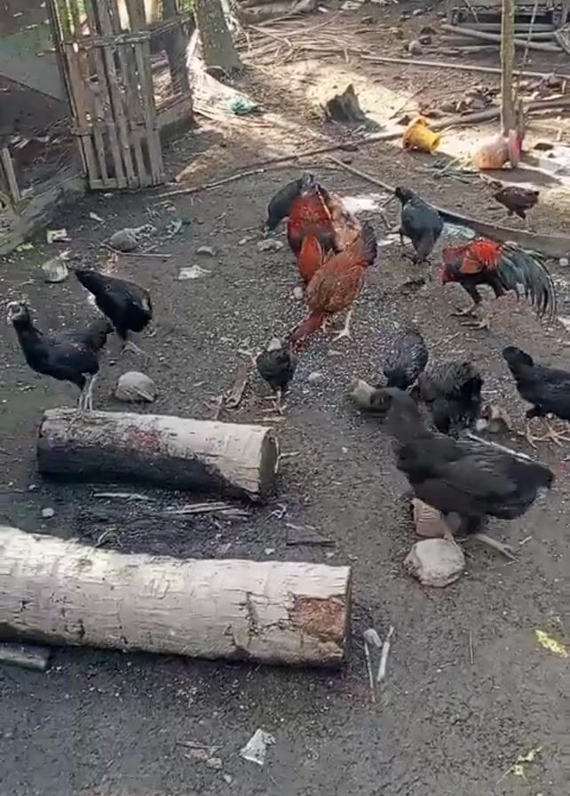 group of chickens roaming around a muddy backyard. There are several black chickens and two roosters with colorful feathers. The ground is littered with debris, including coconuts, logs, and plastic. There are old wooden structures in the background. The environment appears rural and somewhat cluttered. The chickens are pecking at the ground, seemingly searching for food.