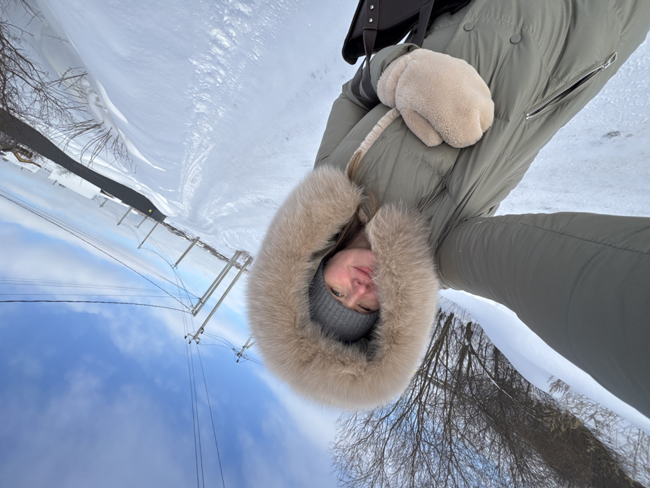 A woman, angled downward, wears a grey winter coat with a large fur-lined hood and a grey knit hat. Her left hand is in a cream-colored mitten. Power lines are visible against a blue and cloudy sky. Behind her, a snow-covered area stretches toward trees and distant buildings. The image is rotated, giving a sense of looking down from above.