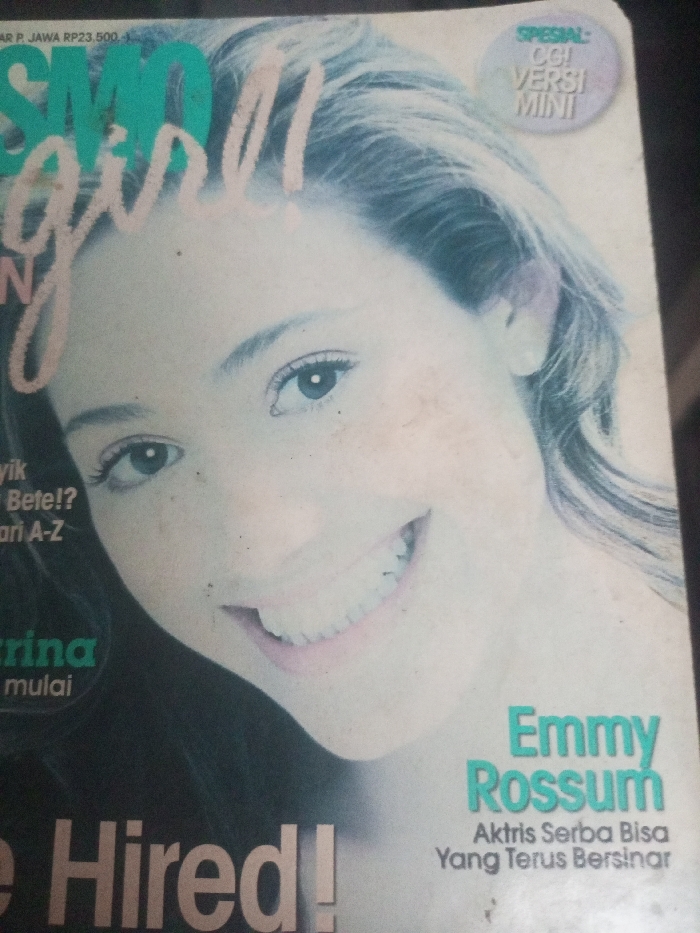 This image presents a close-up, angled view of a physical magazine cover, illuminated by indirect light. The cover prominently features a smiling young woman, identified by teal text at the bottom right as "Emmy Rossum." She has light skin, dark eyes, and a broad smile, revealing her white teeth. Her dark hair frames her face and extends over her shoulders. The magazine title "COSMO girl" is visible at the upper left in a combination of green and pink lettering. Additional text elements include a purple oval at the upper right with "SPESIAL: CGI VERSI MINI," and Indonesian text below Emmy Rossum's name that reads "Aktris Serba Bisa Yang Terus Bersinar" (Versatile Actress Who Continues to Shine). A partial price "P. JAWA RP23.500,-" is visible at the top left. Other fragmented text includes "Bete!?" and "Be Hired!". The magazine cover displays minor surface imperfections consistent with use or handling, such as faint smudges or dust particles across the image and text areas. The background behind the magazine is dark and out of focus. The scene is located in the city of Zee Pin Kone, Myanmar.
