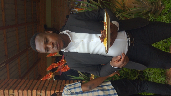 A man in a black suit and white shirt holds a plate with food. He stands near orange flowers and greenery, with a brick structure visible behind him. Another person, wearing a blue and white plaid shirt, is partially visible in the lower part of the image. The setting appears to be outdoors.