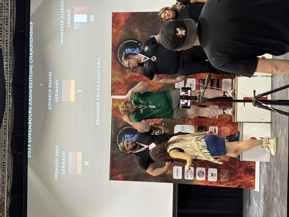 backdrop display for the "2025 Luxembourg Armwrestling Championship." The display includes participant names and their respective countries. Participants listed are Fremgen Josh and Gockeln Daniel from Germany, and Vanacker Alexan from France. The category is "Beginner 95+ Kg Right Arm." Three men stand in front of the display, likely medal winners. Medals are visible around their necks. A woman stands next to one of the men in the image. A phone on a tripod is recording the scene.