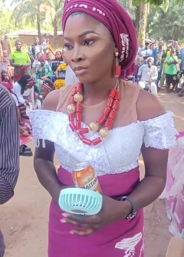 A woman in a traditional African outfit stands outdoors, holding a drink and a small fan, against a backdrop of a crowd of people