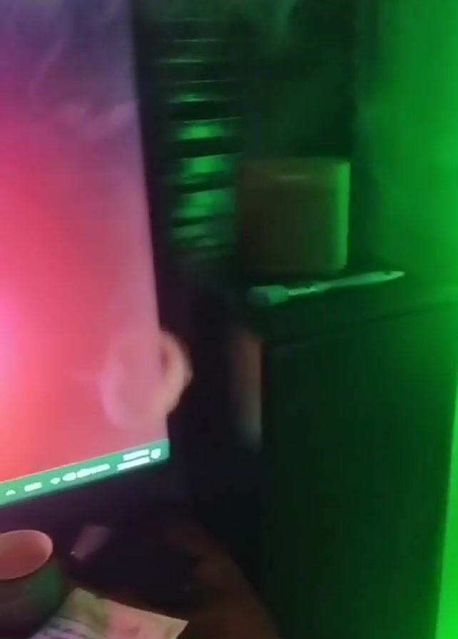 computer monitor with a red and pink gradient background. The screen displays icons in the top left corner. A dark desk is visible beneath the monitor, with a small cup, possibly containing liquid, and small paper packages. A green light source illuminates the right side of the video.