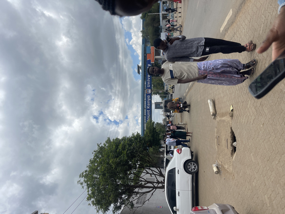 This image depicts an urban street scene in Thika, Kenya, specifically identifiable by the "Mount Kenya University" archway, placing it within the vicinity of Hospital Ward